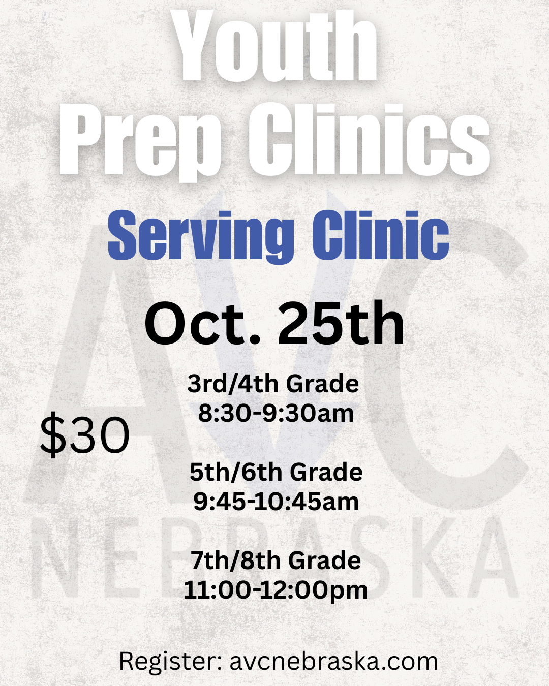 Join us for a youth serving clinic on Oct. 25th! Clinic is $30