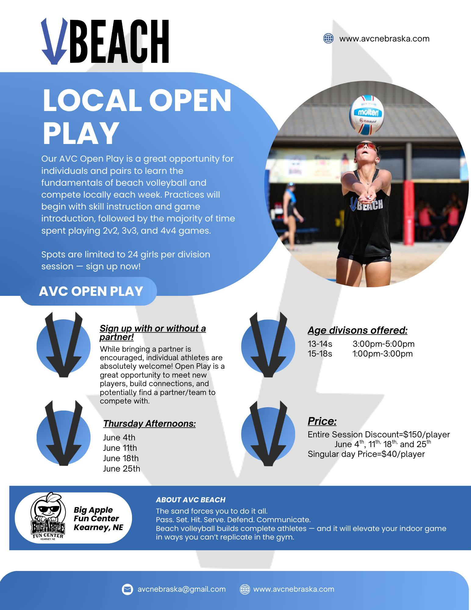 - All sessions take place at The Big Apple Fun Center in Kearney.
